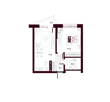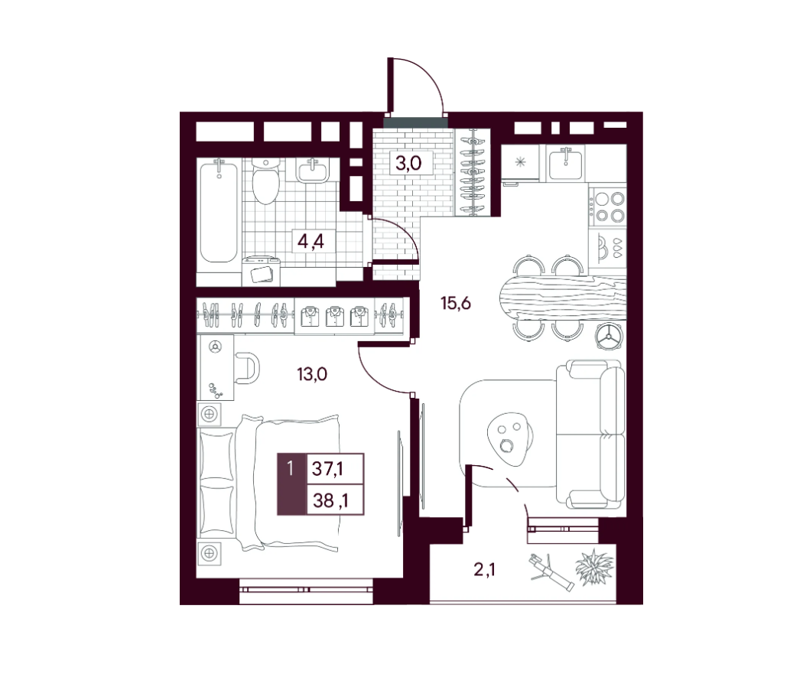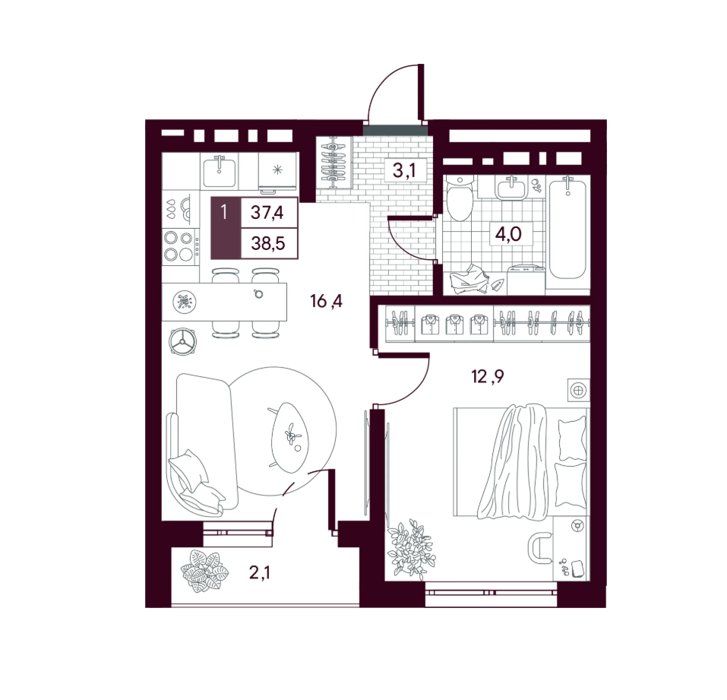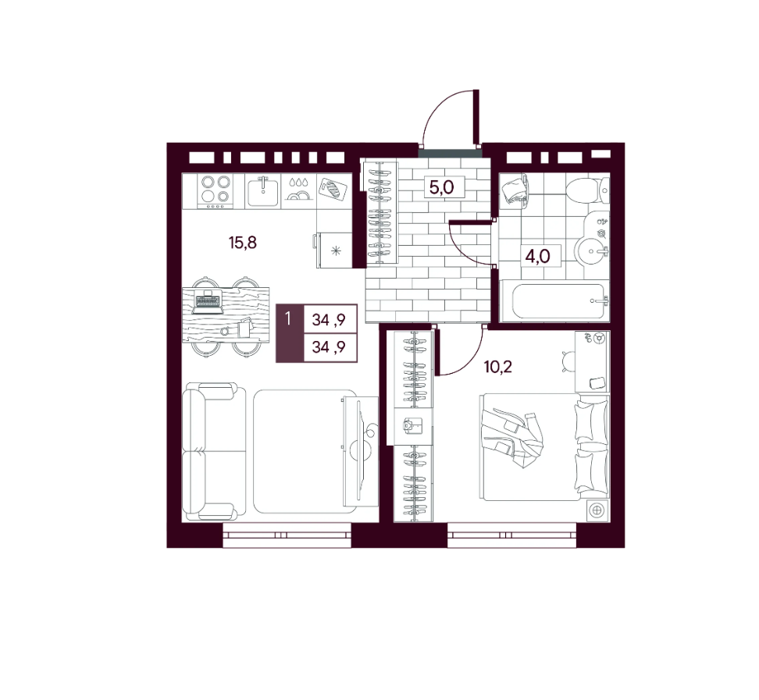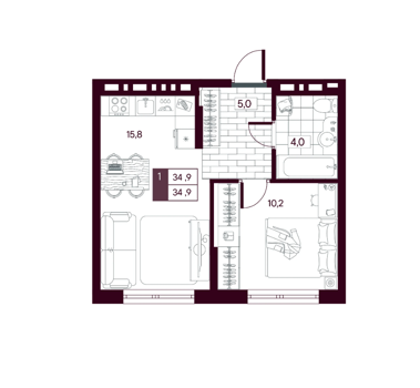 Площадь от 34.9 м2