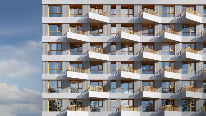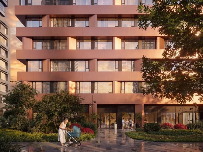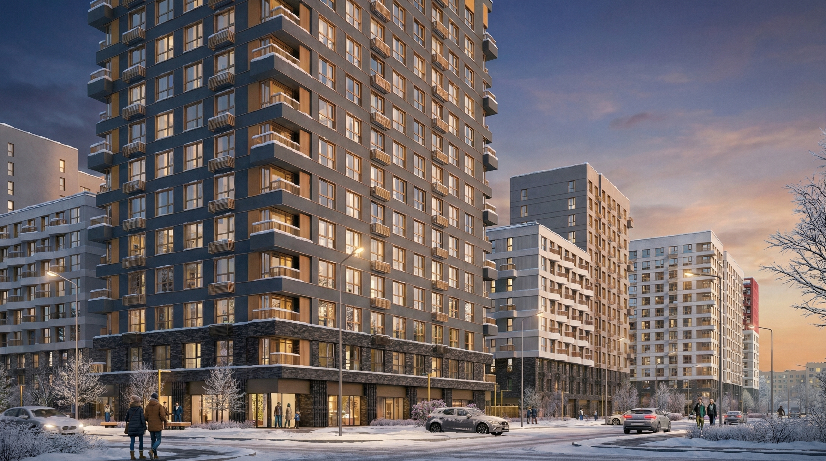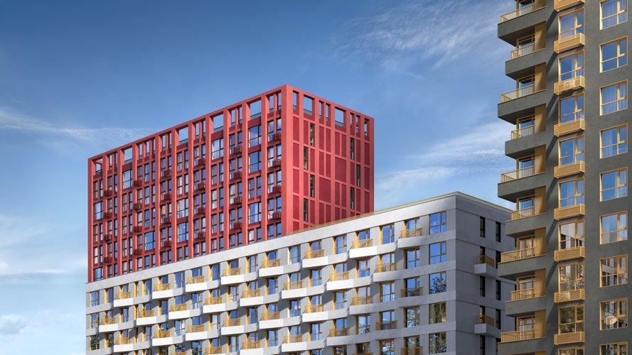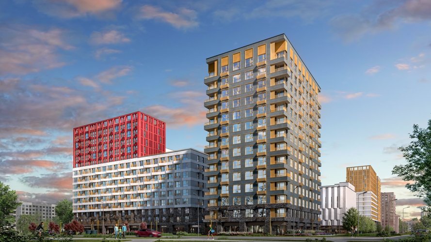 Шесть домов с выразительными фасадами и разнообразием фактур формируют современный жилой ансамбль. Закрытые дворы с озеленением, коммерческие пространства и наземный паркинг создают сбалансированную городскую среду.