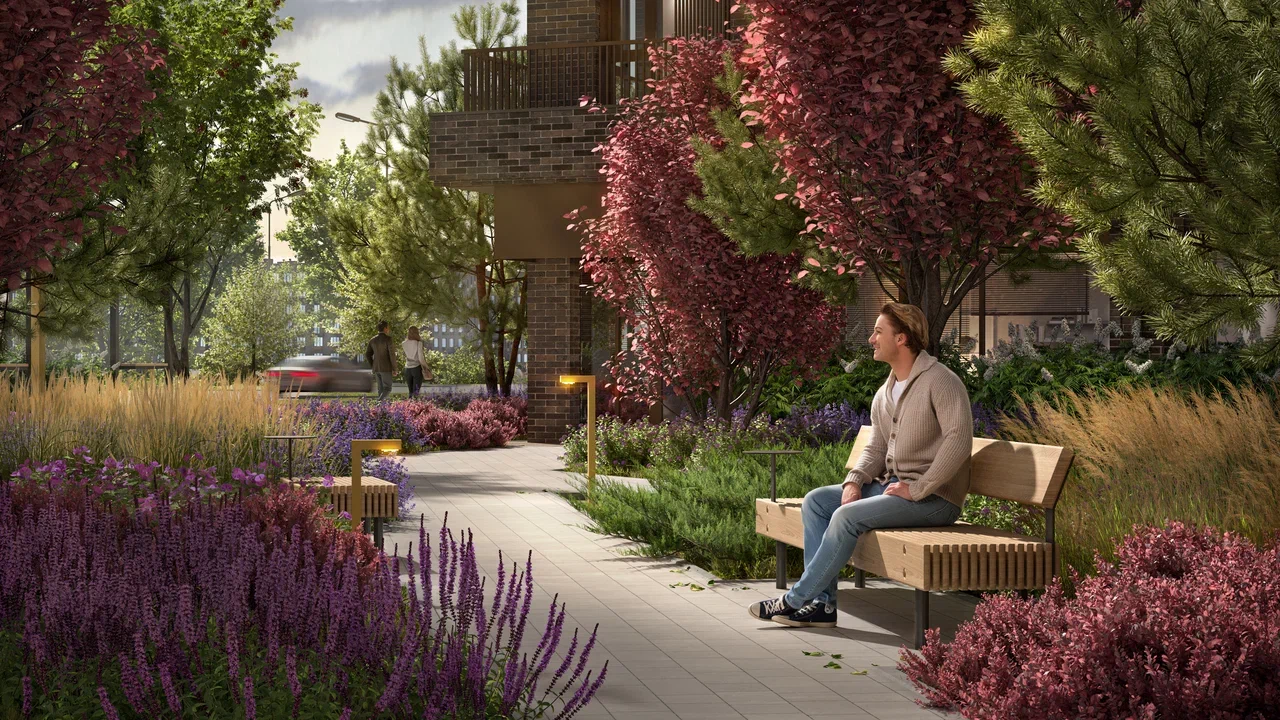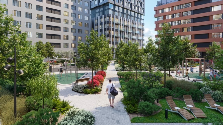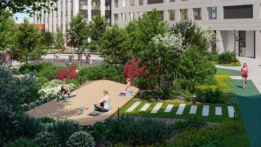 Более 500 крупномерных деревьев формируют развитое озеленение двора, создавая комфортную природную среду прямо в структуре квартала.