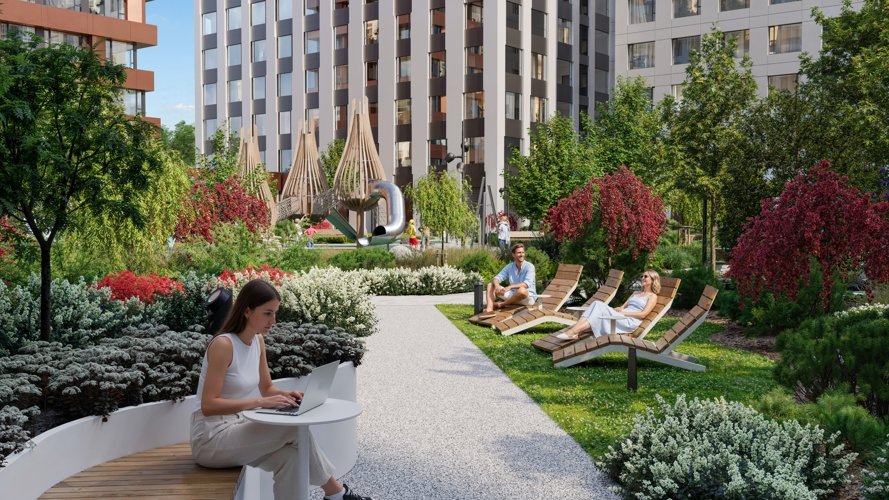 Вокруг проекта сформирована природная и рекреационная среда: живописная роща, благоустроенный парк Тюменской слободы и протяжённые прогулочные маршруты. Велодорожки связывают район в единую систему, а зимой территория дополняется катком для активного отдыха.