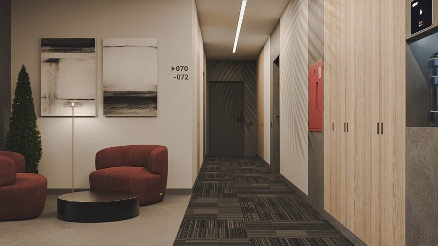 Каждый этаж дома — это не просто коридор, а продуманное пространство для отдыха и встреч. Стильные холлы с дизайнерским оформлением и уютные мягкие зоны созданные для комфорта.