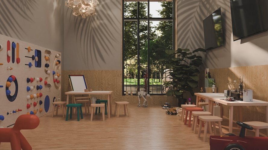 Вдохновляющее пространство для игр и общения: мягкий свет, удобная мебель, атмосфера беззаботного веселья.