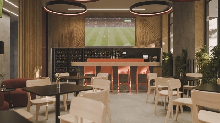 Также во дворе есть зоны барбекю и несколько детских площадок. Для любителей спортивных матчей и концертов есть свой кафетерий с большими экранами. Организован комфортабельный коворкинг для тех, кому не хочется работать за компьютером дома.