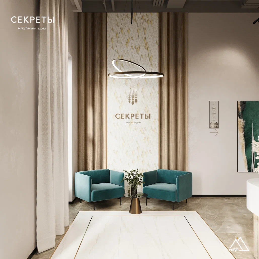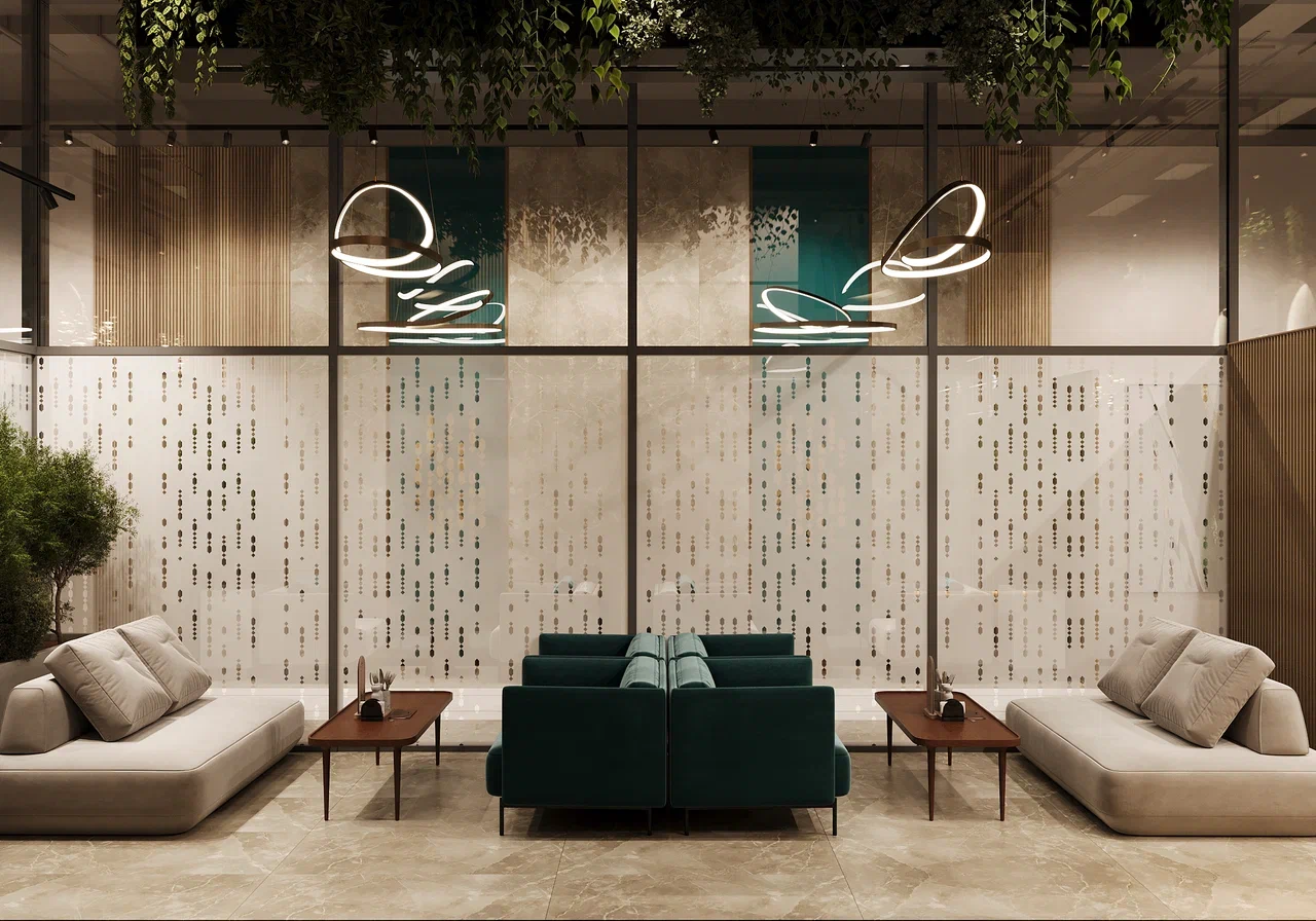 Пространство дополняет изысканная мягкая зона ожидания — уютная и приватная атмосфера для встреч с гостями, ожидания автомобиля или коротких деловых переговоров. Лобби выполнено как полноценное общественное пространство клубного формата.