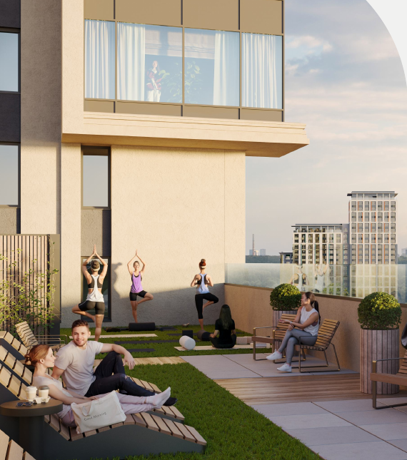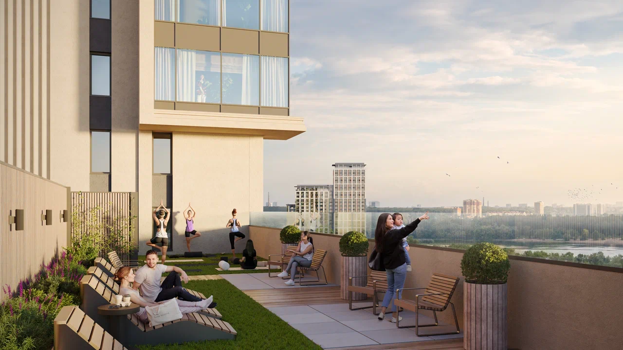 Для резидентов клубного дома предусмотрена открытая благоустроенная терраса на крыше — приватное пространство для отдыха и восстановления.