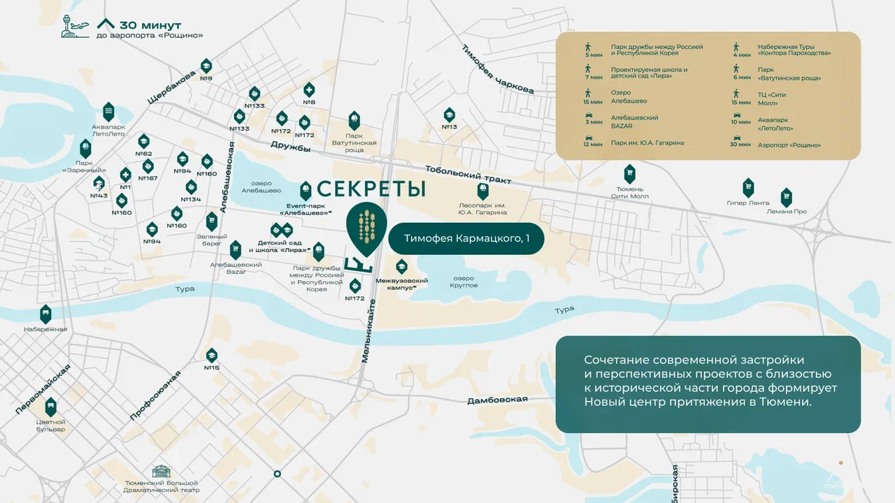 Парк имени Ю. А. Гагарина, Ватутинская роща, Парк дружбы России и Республики Корея, а также озеро Алебашево — всё в удобной доступности от дома.