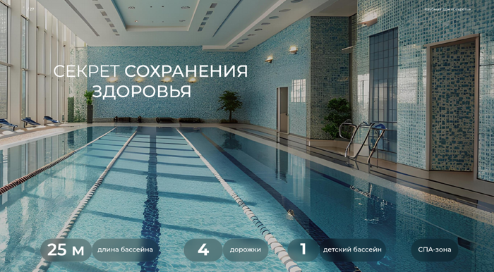Для жителей дома предусмотрена собственная wellness-инфраструктура: просторный бассейн длиной 25 метров с четырьмя дорожками для комфортного плавания.
